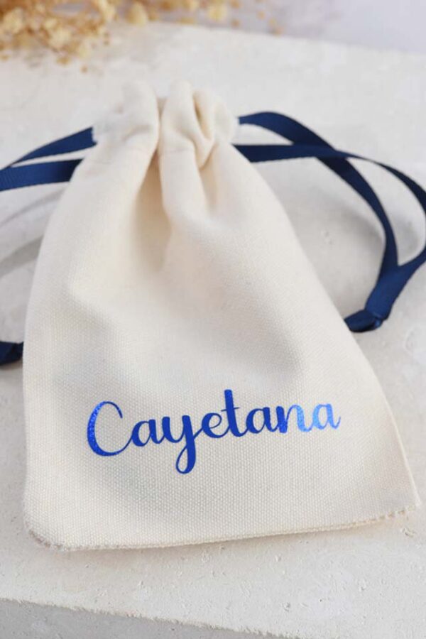 Su empaque es una bolsa de algodón 100%, personalizada con nombre o iniciales.
