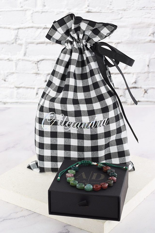 Todos nuestros productos de plata vienen empacados en nuestra bolsa insignia de cuadros Vichy blanco y negro personalizada con vinilo textil plateado, esta bolsa se puede personalizar con el nombre o las iniciales y tiene una medida de: 16 cms de ancha x 26 cms de larga y esta fabricada en algodón.